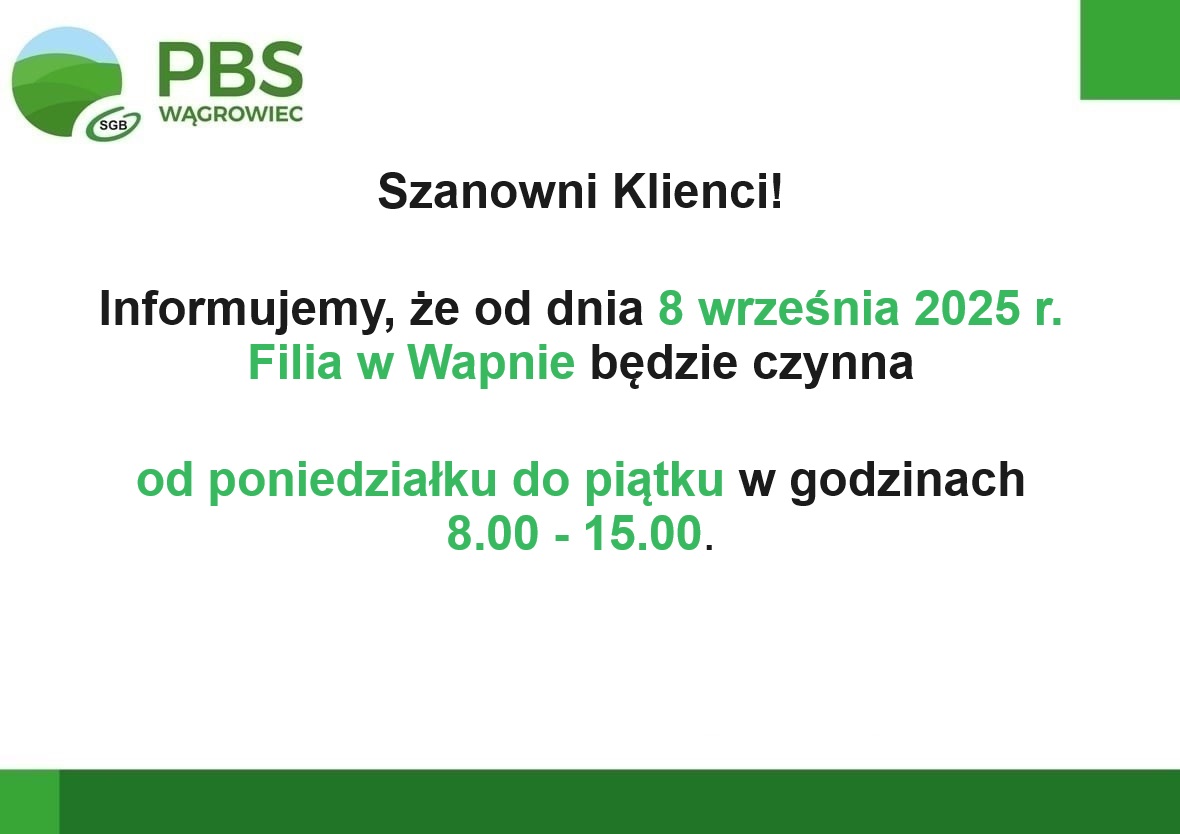Od 8 września 2025 r. wracamy do wcześniejszej dostępności Filii w Wapnie, tj. będziemy otwarci dla Klientów od poniedziałku do piątku w godzinach od 8.00 do 15.00.